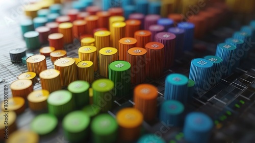 A close-up of colorful audio mixer knobs and controls, showcasing sound mixing equipment.