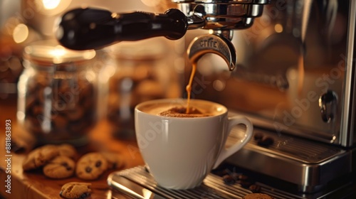 A close-up of espresso being poured into a cup, with a cookie jar in the background