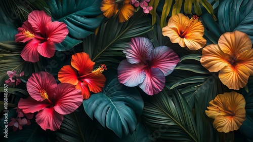 A close-up of exotic birds of paradise with hibiscus flowers and palm fronds, vibrant colors in feathers and petals, gentle sunlight casting shadows, detailed and captivating tropical composition.
