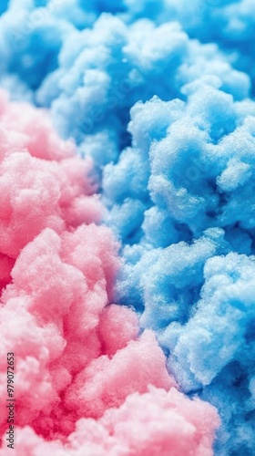 A close-up of fluffy pink and blue cotton candy, evoking a whimsical and sweet atmosphere.