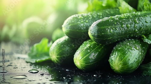 A close-up of fresh cucumbers with water droplets on a dark surface, emphasizing freshness. Perfect for food, health, and organic farming visuals.