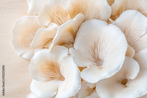 A close-up of fresh oyster mushrooms sprouting from a substrate bag, showing detailed textures and natural colors