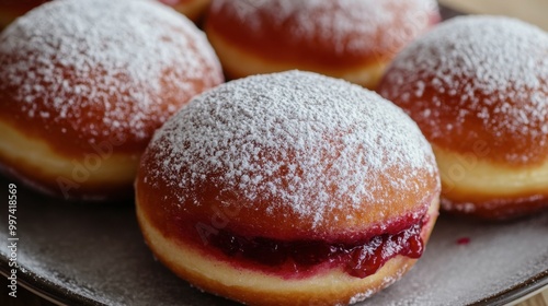 A close-up of freshly baked jelly-filled donuts, dusted with powdered sugar, oozing with raspberry filling.