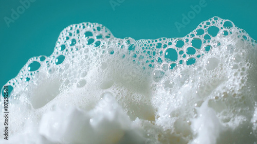 A close-up of frothy soap bubbles against a turquoise background, creating a clean and refreshing aesthetic.
