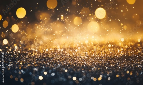 A close-up of glittering golden particles in mid-air, set against a dark background with a bokeh effect, creating a luxurious and festive atmosphere