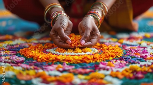 A close-up of hands arranging vibrant flower petals in an artistic pattern, symbolizing joy and celebration during cultural festivals.