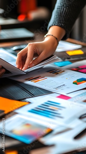 A close-up of hands placing marketing brochures on a desk, surrounded by campaign details and promotional materials