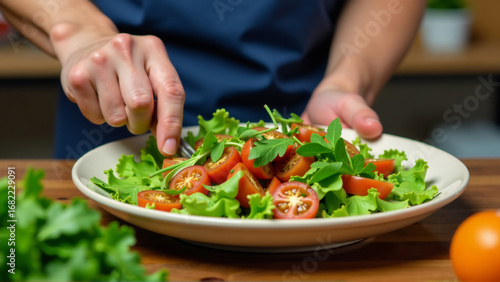 A close-up of hands preparing a vegan meal, with a focus on the fresh ingredients and the cooking process.