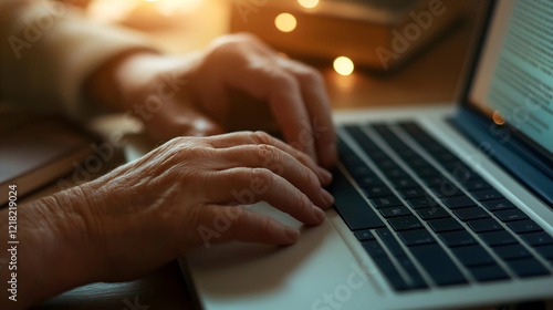 A close-up of hands typing on a laptop keyboard, surrounded by warm lighting and books, suggesting a cozy work or study environment.