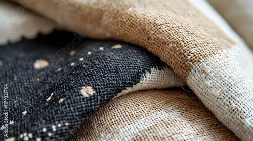 A close-up of hand-stitched patterns on thick linen fabric in earthy tones.