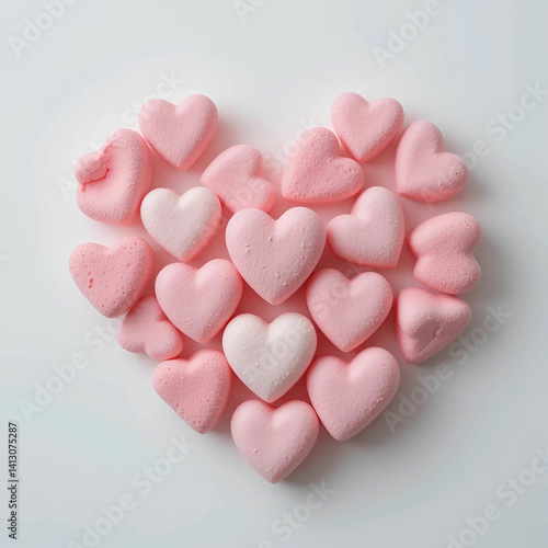 A close-up of heart-shaped marshmallows scattered over a white background, showcasing their soft texture.
