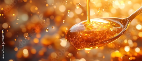 A close-up of honey dripping from a spoon, illuminated by warm, golden light.