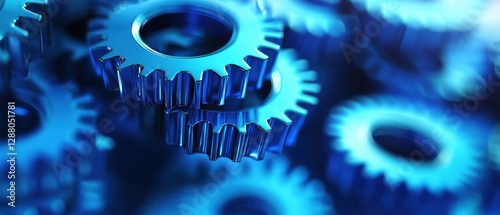 A close-up of interlocking blue gears, showcasing intricate details and a sleek design, emphasizing mechanics and technology.