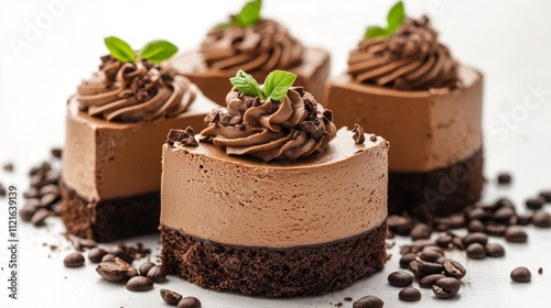 A close-up of mocha mousse cakes topped with chocolate swirls and coffee beans, arranged on a white surface with scattered coffee beans