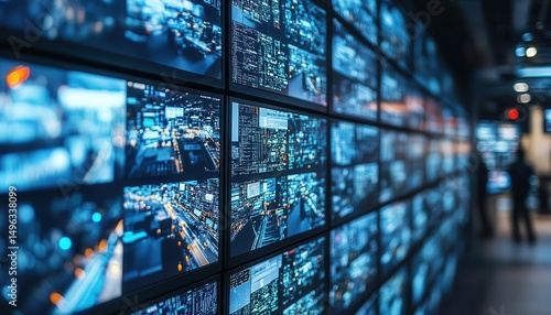 A closeup of network traffic monitors in a security office, Cybersecurity, Detailed and protective