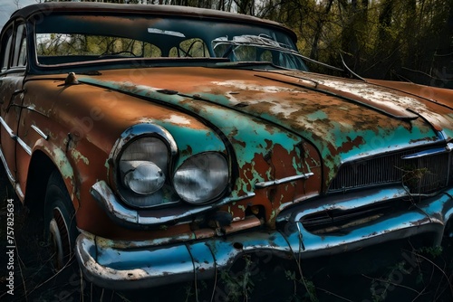 A close-up of peeling paint on an abandoned vintage vehicle.