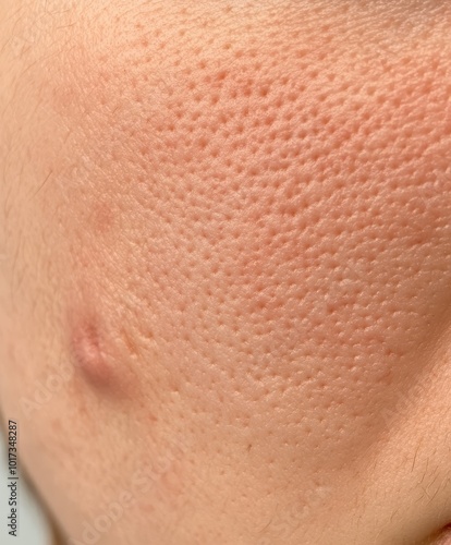 A closeup of problematic skin with visible acne and redness before treatment, set against a neutral background for skincare tutorials and product use.