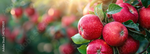 A close-up of several ripe red apples hanging on a branch in an orchard, with the sun shining through the leaves