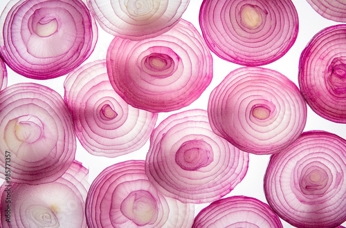 A close-up of sliced red onion highlighting the vibrant pink and purple hues