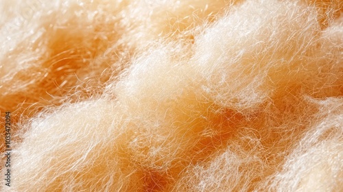 A close-up of soft, fluffy fibers in warm tones, showcasing a textured and delicate appearance that resembles cotton or wool.