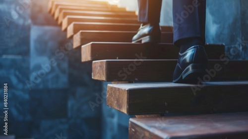 A closeup of someones feet walking up a set of wooden stairs in a modern building.