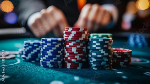 A close-up of stacked poker chips on a casino table, with a person's hands poised, illustrating the excitement of gambling.
