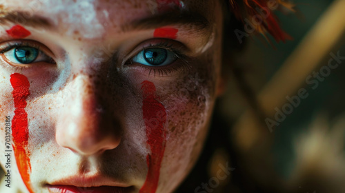 A closeup of the aerial acrobats face, displaying intense concentration and focus.