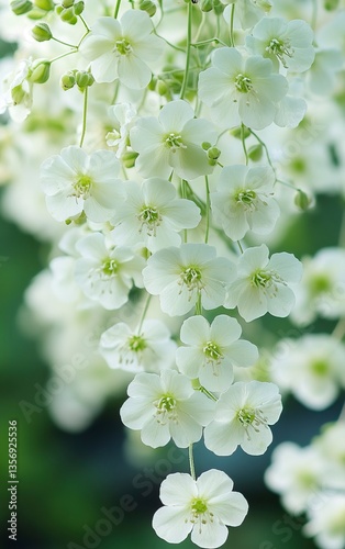 A close-up of the delicate white flowers hanging from Euphorbia, a type of spurge with beautiful small and large flower heads that form an elegant arch on its stem. The background is blurred to highli