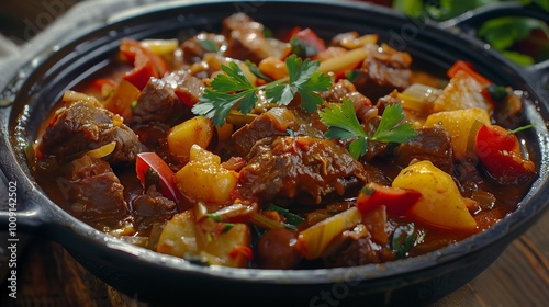 A close-up of the dish is shown - a thick meat stew with vegetables and spices. A great option for advertising food, restaurants or food blogs.