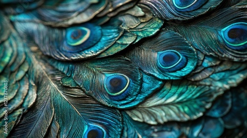A close-up of the intricate patterns on an iridescent peacock feather, showcasing its vibrant blue and green hues. The focus is sharp to capture every detail in high resolution.