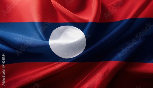 A close-up of the Laotian flag, flowing in the wind, with vibrant red, blue, and white colors.