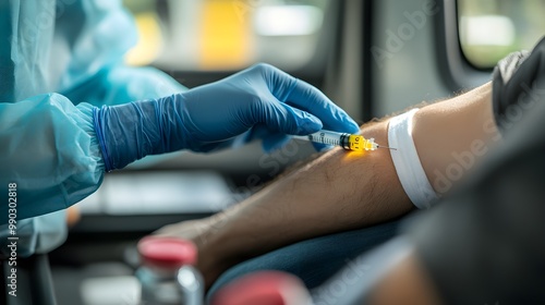 A close-up of the patient's arm as a healthcare professional applies a bandage after administering the vaccine, with the syringe visible on a tray