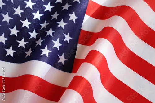 A close-up of the waving United States flag, showcasing its vibrant red and white stripes and white stars on a blue field. The fabric's folds and lighting add a dynamic sense of movement and texture.