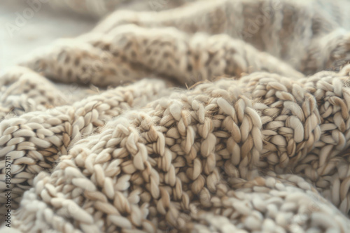 A close-up of thick, soft, woolen knitting in a cozy, neutral tone, conveying warmth and comfort.