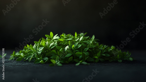A close-up of thyme leaves arranged in a small cluster on a smooth matte black surface, showing fine texture and vivid green color.