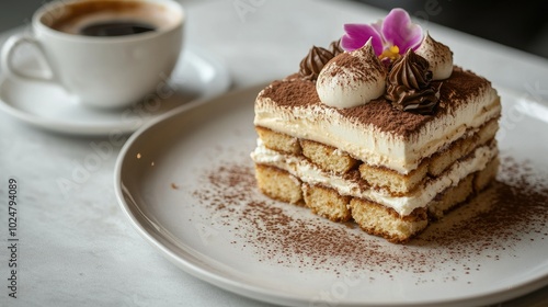 A close-up of Tiramisu on a white plate, highlighting the creamy mascarpone and layered biscuits, served alongside a cup of coffee, all presented on a stylish gray concrete background.
