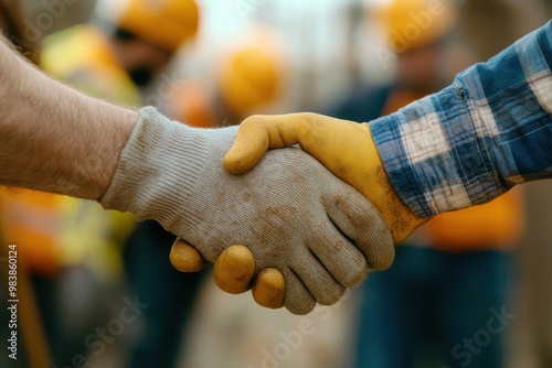 A close-up of two construction workers in gloves clasping hands, possibly in a handshake