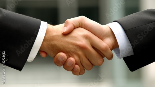 a close-up of two hands in a firm handshake, both wearing professional suits, symbolizing a successful business agreement. The blurred background suggests a modern office environment.
