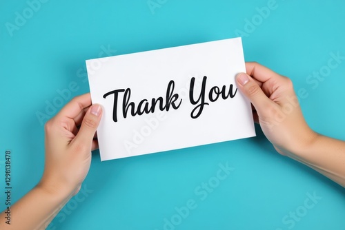 A Close-Up of Two Hands of an Unknown Adult Individual Holding a 'Thank You' Card Against a Bright Turquoise Background, Expressing Gratitude and Appreciation.