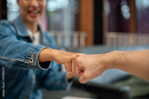 A close-up of two people giving each other a fist bump during a meeting at a coffee shop.