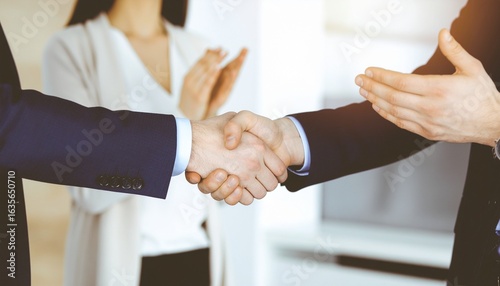 A close-up of two people shaking hands in a modern office with a blurred background of colleagues.