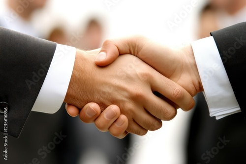 A close-up of two white-collar workers shaking hands after a successful meeting, with colleagues in the background.