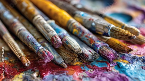A close-up of used paintbrushes resting on a colorful, textured palette filled with vibrant paint
