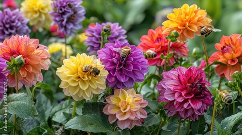 A close-up of vibrant garden flowers in various colors, with bees buzzing around them