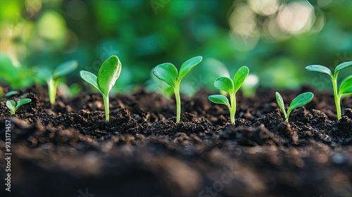 A close-up of vibrant green seedlings sprouting from rich, dark soil, representing new beginnings and growth.