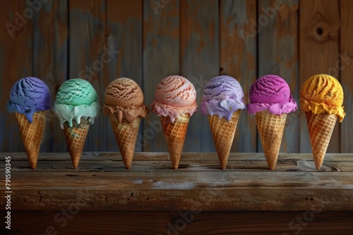 A close-up of vibrant ice cream flavors in a waffle cone, placed on a wooden table.