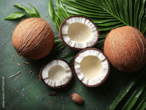A close-up of whole and halved coconuts surrounded by green leaves on a textured surface.