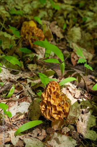 A close-up of yellow Morel Mushrooms growing on the forest floor