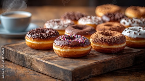 A close-up perspective of assorted donuts with different toppings, including glaze, chocolate, and sprinkles, set on a rustic wooden table with a steaming cup of coffee,