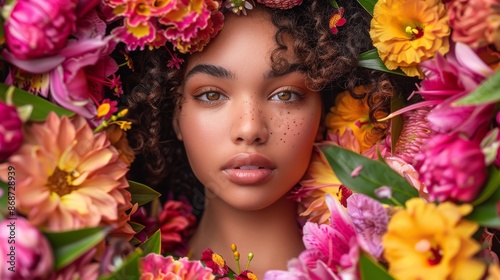A close-up photograph of a young woman surrounded by a vibrant array of flowers, showcasing her beautiful face and captivating expression
